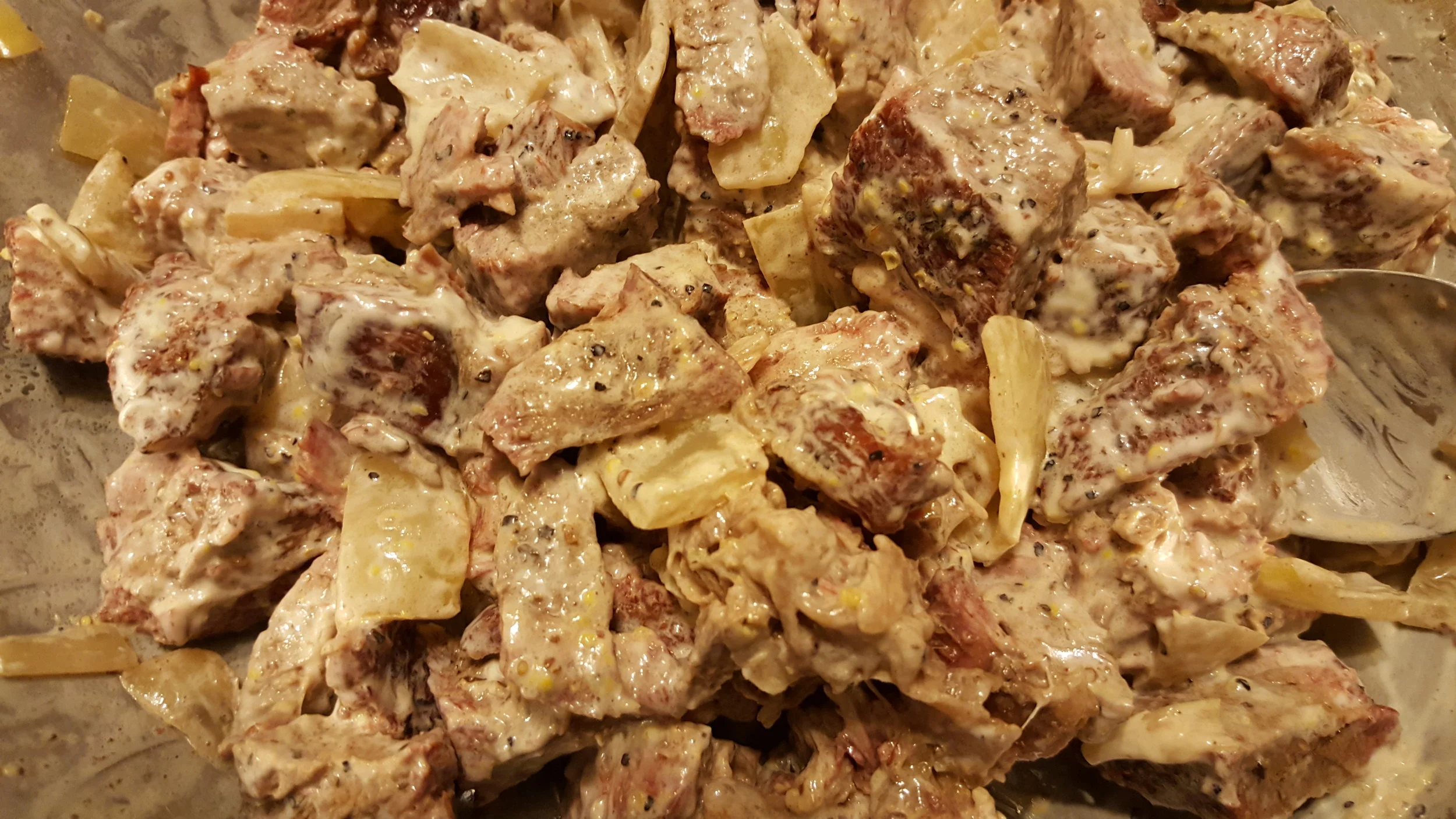 Add mayonnaise and Dijon mustard; combine the meat/onion/mayo/mustard mixture.