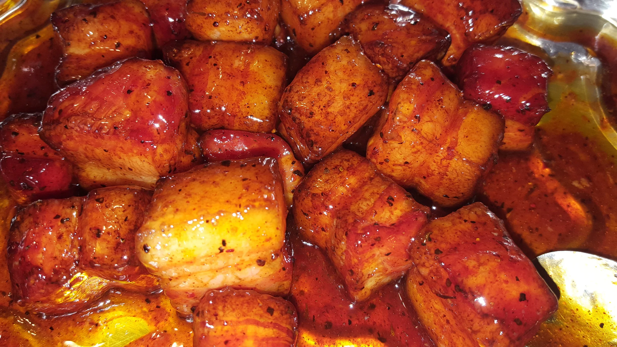 - 1. Remove skin from pork belly if not already done. Cut pork belly into 1” square cubes. Place in large bowl and mix with rub.