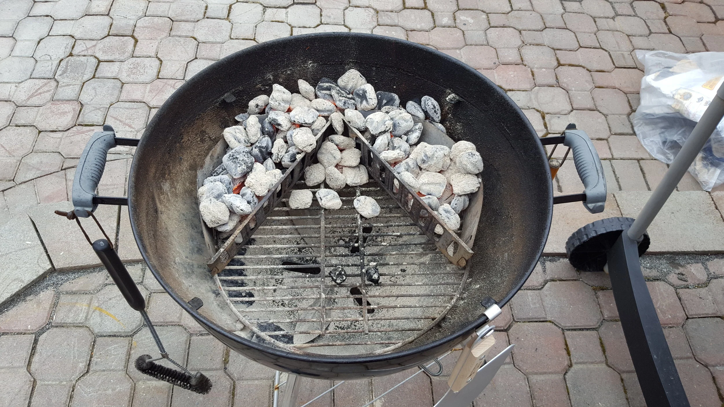 For my first time around, I did read the instructions on how to set up the KP. In short, they recommend you light a full charcoal chimney and dump it in the back of the kettle in a "C" pattern, this way no charcoal gets under the pizza stone. In my case, I used my charcoal baskets to help make the "C" and added about half of a chimney full of unlit briquettes as well as 4 – 5 chunks of hardwood. The hardwood will not smolder, but rather ignite and help get high temps (above 700°F).